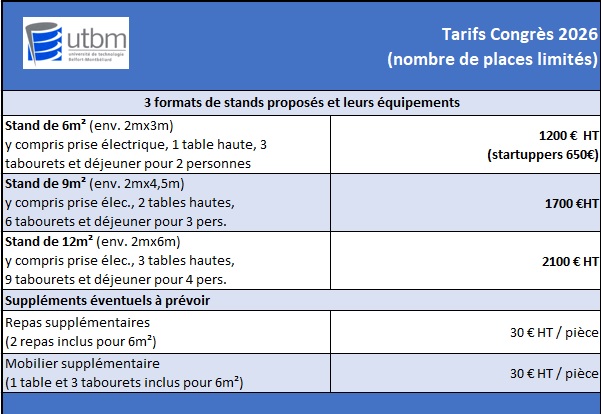 Les frais de participation varient en fonction de la taille du stand choisi et des prestations (les tarifs seront accessibles sur cette page à partir de janvier 2026).