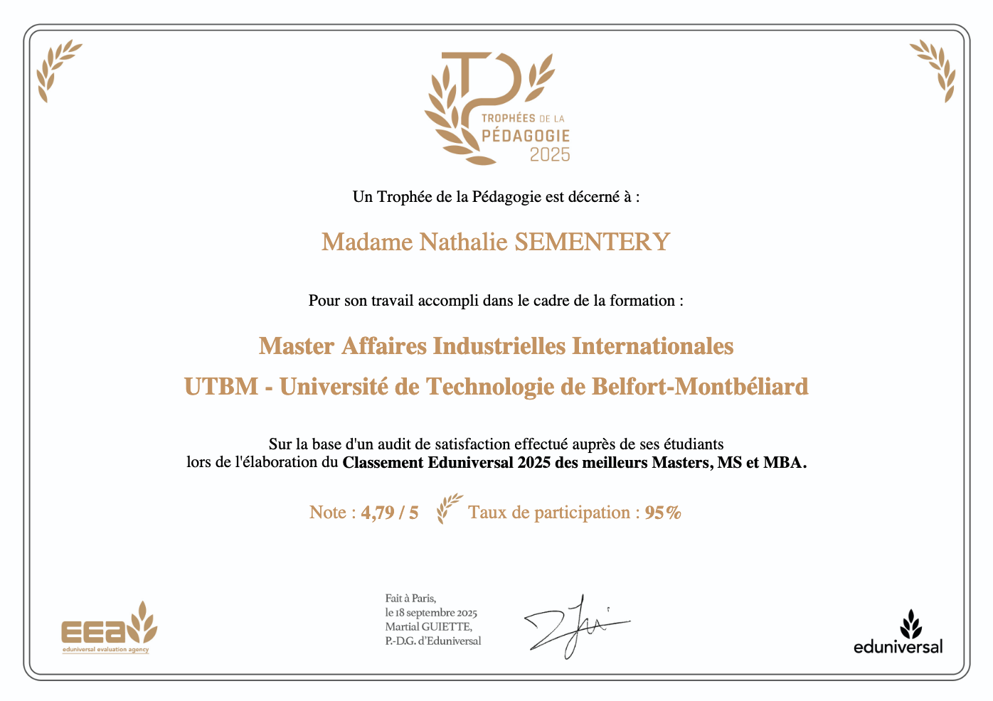 Dans ce cadre, l’UTBM figure parmi les établissements récompensés, avec une distinction obtenue par le master Affaires Industrielles Internationales, salué par une note de 4,79 sur 5.